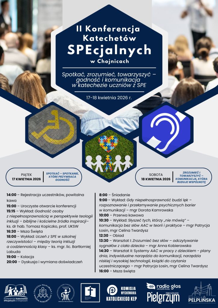 Katecheci specjalni z Chojnic, we współpracy z Wydziałem Katechetycznym oraz Duszpasterstwem Osób z Niepełnosprawnościami Diecezji Pelplińskiej, zapraszają do udziału w II Konferencji Katechetów SPEcjalnych w Chojnicach, która odbędzie się w dniach 17-18 kwietnia 2026 r.