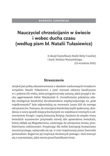 Swoimi refleksjami naukowymi podzieliło się dziesięć osób. Są wśród nich osoby świeckie, zakonne i duchowne reprezentujące różne środowiska akademickie. Podjęte w poszczególnych artykułach zagadnienia dotyczą: problemu piękna, kultury jako światła nadziei, męstwa chwalebnego bł. Natalii, a także codzienności i heroiczności jej nauczycielstwa. Celem rozważań zawartych w prezentowanej monografii jest zaproszenie Czytelników do edukacyjnej refleksji nad wybranymi aspektami postawy nauczycielskiej bł. Natalii Tułasiewicz, nad przesłaniem jej życia, a także zainspirowanie do głębszego namysłu nad specyfiką owej postawy w kontekście współczesnych wyzwań.