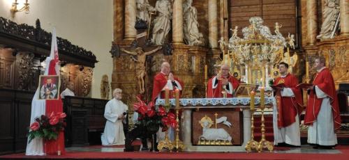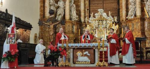 Mszy św. przewodniczył Gospodarz Parafii, ks. dziekan Bogdan Żygadło, a celebrowali ją kapłani z naszej Wspólnoty oraz ks. dr Jarosław Kowalczyk, dyrektor Wydziału Katechetycznego Legnickiej Kurii Biskupiej, który wygłosił homilię. Zwracając się zarówno do ludzi Solidarności i pedagogów, wskazując na Patronów obu tych grup, odwołał się do Słowa Bożego: „Komu wiele dano, od tego wiele wymagać się będzie; a komu wiele zlecono, tym więcej od niego żądać będą” (Łk 12,48) oraz łacińskiej sentencji: „Frustravivit qui neminiprodest” (Na próżno żyje ten, kto nikomu służy). Życie bł. Księdza Jerzego i bł. Natalii Tułasiewicz było zawsze służbą drugiemu człowiekowi. Bardzo mocno podkreślił, jak ważne jest dla nas, abyśmy patrząc na życie tych Patronów, umieli się zainspirować do pełnienia swojej misji. A czym oni nas inspirują? Przede wszystkim wiernością swojemu powołaniu.