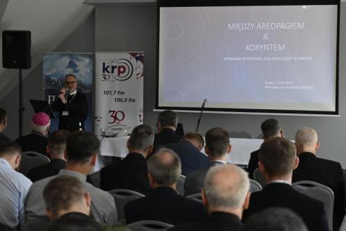 W pierwszym referacie zatytułowanym „Między Areopagiem a Koryntem” o. Mirosław Chmielewski przedstawił efekty swoich badań naukowych dotyczące katechezy w parafii. Prelegent podkreślił potrzebę właściwego odczytania rzeczywistości, w której się znajdujemy. Posługując się obrazem Aten i Koryntu ukazał, jak trudnym zadaniem jest głoszenie Ewangelii. W Atenach święty Paweł podejmuje się głoszenia Dobrej Nowiny o Jezusie. Ta próba głoszenia, mimo wielkiej erudycji i talentu mówiącego, kończy się fiaskiem. Zdaniem o. Mirosława w tej sytuacji można poszukiwać pewnych analogii do współczesnej sytuacji nauczania lekcji religii w szkole w Polsce. Prelegent podkreślał potrzebę właściwego odczytania adresata i kontekstu współczesnego przepowiadania.