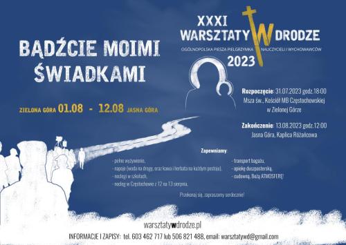 W terminie od1 do 12 sierpnia 2023 roku będą miały miejsce „Warsztaty w Drodze”. Jest to Ogólnopolska Piesza Pielgrzymka Nauczycieli i Wychowawców z Zielonej Góry na Jasną Górę. Zachęcamy do udziału w tych wydarzeniach. Więcej informacji na plakacie.