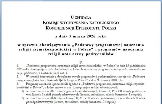 Uchwała Komisji Wychowania Katolickiego KEP w sprawie obowiązywania „Podstawy programowej nauczania religii rzymskokatolickiej w Polsce” i programów nauczania religii oraz oceny podręczników (z dnia 3 marca 2026 roku)