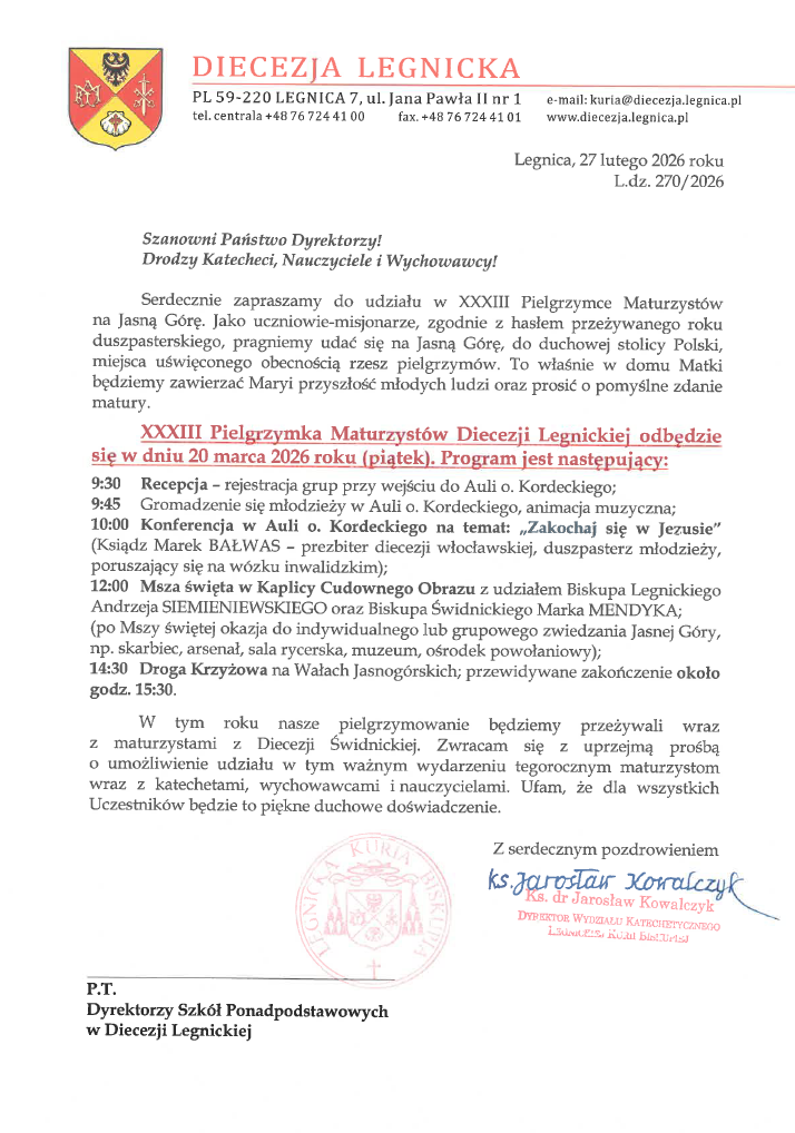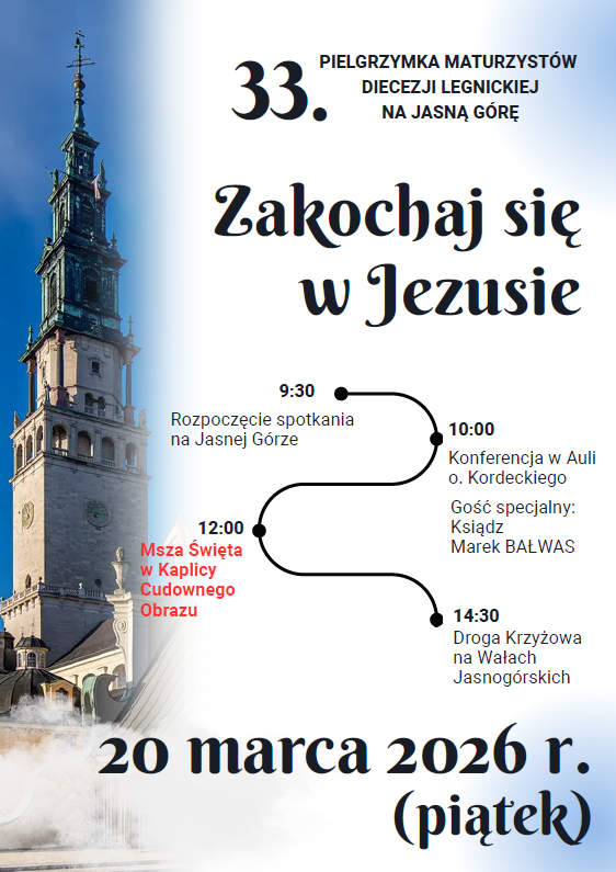 XXXIII Pielgrzymka Maturzystów Diecezji Legnickiej odbędzie się w dniu 20 marca 2026 roku (piątek). Program jest następujący: